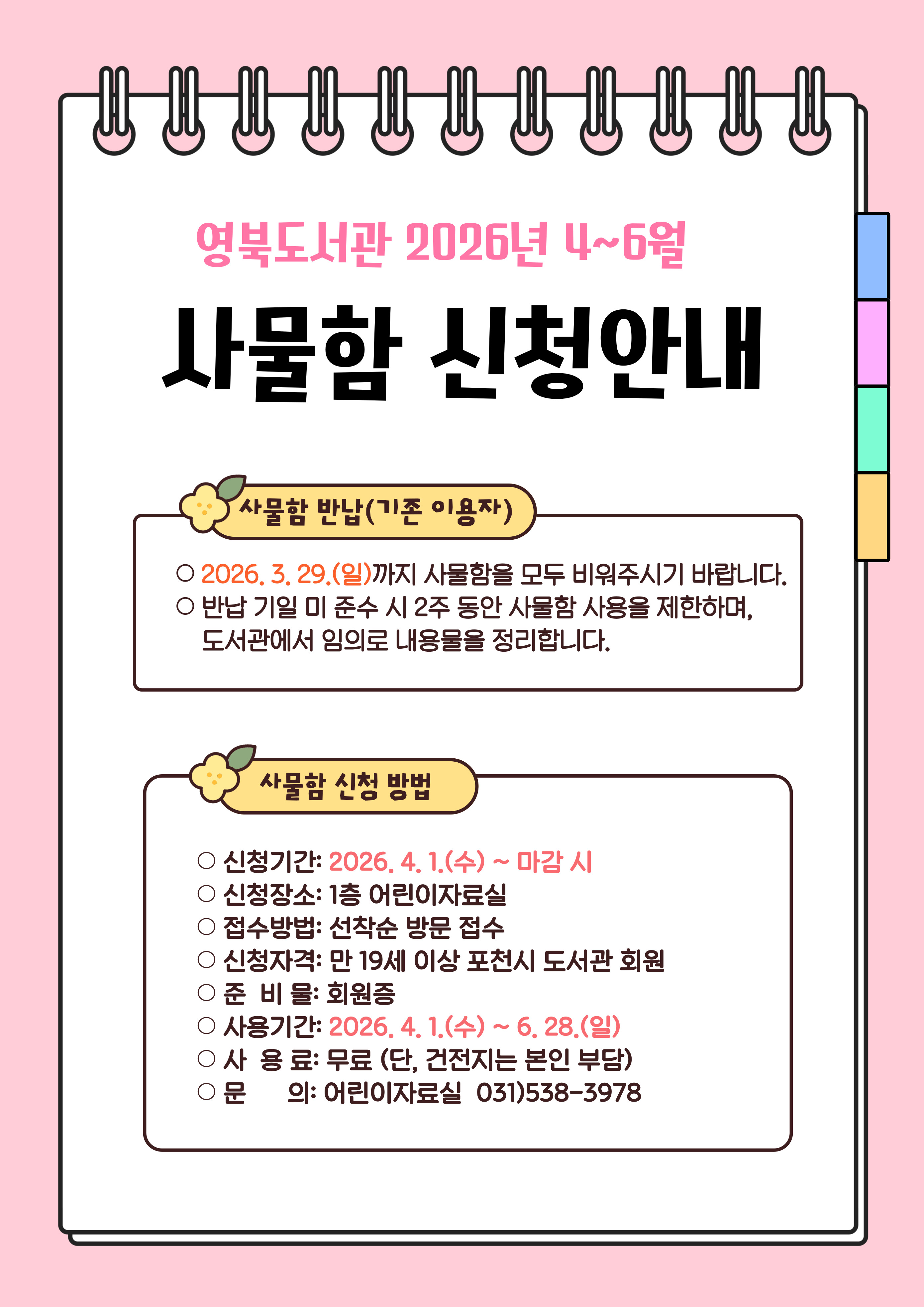 ![]() 영북도서관 2026년 4~6월 사물함 신청안내 사물함 반납 (기존 이용자) ○2026. 3. 29.(일)까지 사물함을 모두 비워주시기 바랍니다. ○반납 기일 미 준수 시 2주 동안 사물함 사용을 제한하며, 도서관에서 임의로 내용물을 정리합니다. 사물함 신청 방법 ○신청기간: 2026. 4. 1.(수) ~ 마감 시 ○신청장소: 1층 어린이자료실 ○접수방법: 선착순 방문 접수 ○신청자격: 만 19세 이상 포천시 도서관 회원 ○준 비 물: 회원증 ○사용기간: 2026. 4. 1.(수) ~ 6. 28.(일) ○사 용 료: 무료 (단, 건전지는 본인 부담) ○문 의: 어린이자료실 031)538-3978 |