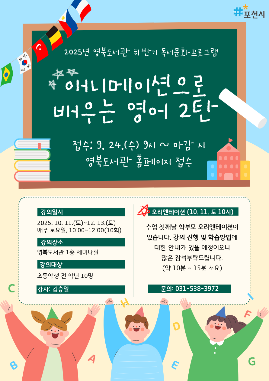 ![]() <2025년 영북도서관 하반기 독서문화프로그램> ★ 애니메이션으로 배우는 영어 2탄 애니메이션도 보고 재밌는 영어공부하러 가자! * 강의일시: 2025. 10. 11.(토) ~ 12. 13.(토) 10:00~12:00 매주 토요일(총 10회) * 강의장소: 영북도서관 1층 세미나실 * 강의대상: 초등학생 전 학년 10명 * 강사: 김승일 * 오리엔테이션 안내(10. 11.토 10시) 수업 첫째날 학부모 오리엔테이션이 있습니다. 강의 진행 및 학습 방법에 대한 안내가 있을 예정이오니 많은 참석 부탁드립니다(오리엔테이션은 약 10분~15분정도 소요됩니다.) * 문의: 031-538-3972 ※ 9. 28.(일)까지 포천시민 우선 접수(이후 포천시민 외 접수 가능) ※ 보호자명으로 접수 시, 비고란에 자녀이름, 학년을 적어주세요^^ ※ 자세한 강의 내용은 강의계획서을 참고해주시기 바랍니다. |