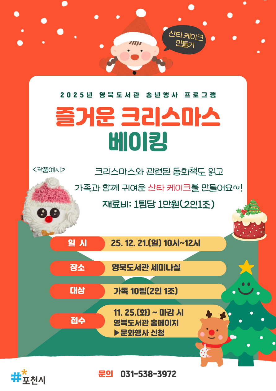 * 비고란에 자녀이름, 거주지역 작성부탁드립니다^^![]() ★ 즐거운 크리스마스 베이킹(산타 케이크 만들기)★ 크리스마스와 관련된 동화책도 읽고 가족과 함께 귀여운 산타 케이크를 만들어요~!! * 일시: 25. 12. 21.(일) 10시~12시 * 장소: 영북도서관 세미나실 * 대상: 가족 10팀(2인1조) * 접수: 11. 25.(화) ~ 마감시(영북도서관 홈페이지 ▶ 문화행사 신청) * 재료비: 1팀당 1만원(강사님 계좌로 입금, 추후 안내 문자 발송 예정) * 문의: 031-538-3972