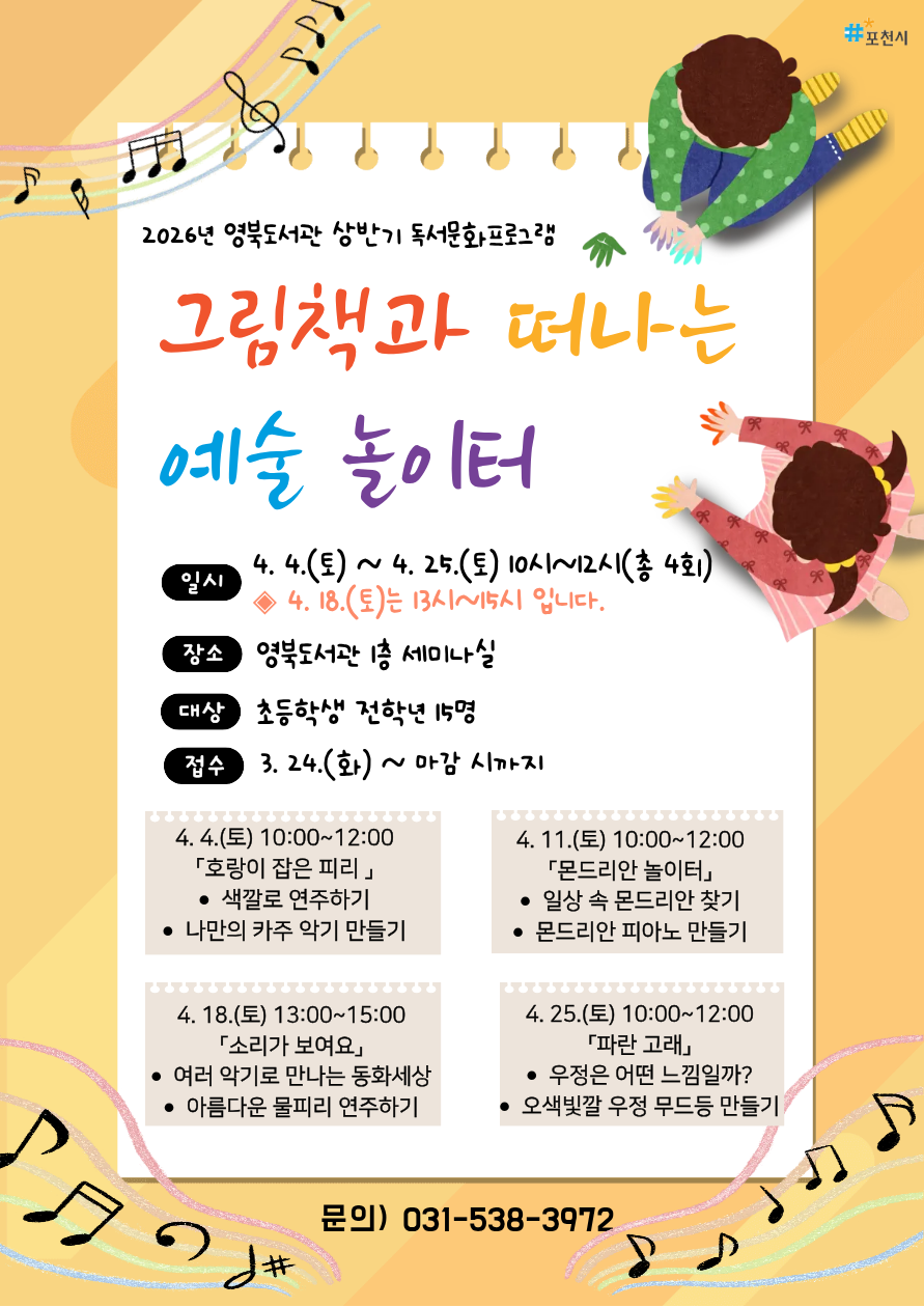 자세한 강의 내용은 강의계획서를 참고하여 주시기 바랍니다^^![]() 2026년 영북도서관 상반기 독서문화프로그램 《그림책과 떠나는 예술놀이터》 * 일시: 4. 4.(토) ~ 4. 25.(토) 10시~12시(총 4회) ※ 4. 18.(토)는 13시~15시 강의가 진행됩니다. * 장소: 영북도서관 1층 세미나실 * 대상: 초등학생 전 학년 15명 * 접수: 3. 24.(화) ~ 마감 시 까지 * 내용 - 4. 4.(토) 10:00~12:00 : 동화책「호랑이 잡은 피리」/ 색깔로 연주하기 / 나만의 카주 악기 만들기 - 4. 11.(토) 10:00~12:00 : 동화책「몬드리안 놀이터」/ 일상 속 모드리안 찾기 / 몬드리안 피아노 만들기 - 4. 18.(토) 13:00~15:00 : 동화책「소리가 보여요」/ 여러 악기로 만나는 동화세상 / 아름다운 물피리 연주하기 - 4. 25.(토) 10:00~12:00 : 동화책「파란 고래」/ 우정은 어떤 느낌일까? / 오색빛깔 우정 무드등 만들기 * 문의: 031-538-3972(영북도서관) ★ 3. 28.(토)까지 5일간 포천시민 우선 신청(이후 포천시민 외 접수 가능) ★ 접수 시, 비고란에 거주 지역(읍/면/동까지) 작성 필수 |
